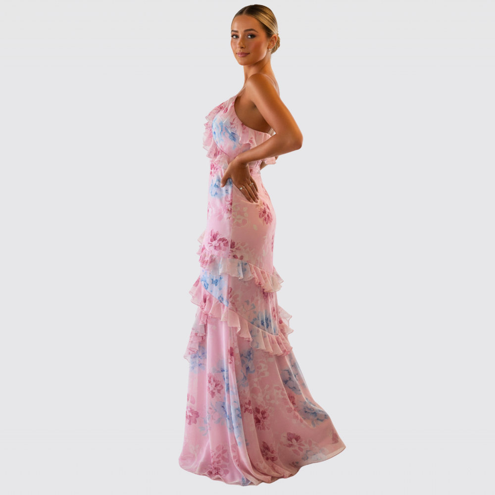 Flow easy through holiday nights in this floral maxi dress that drapes light with spaghetti straps and cascading ruffles for a breezy, flattering fit. Its soft chiffon blooms with pink roses on yellow or blue, hugging your shape just right without cling—slip it on for Christmas parties or dinners, pairing with heels for that effortless glow that lets you dance or chat all evening.