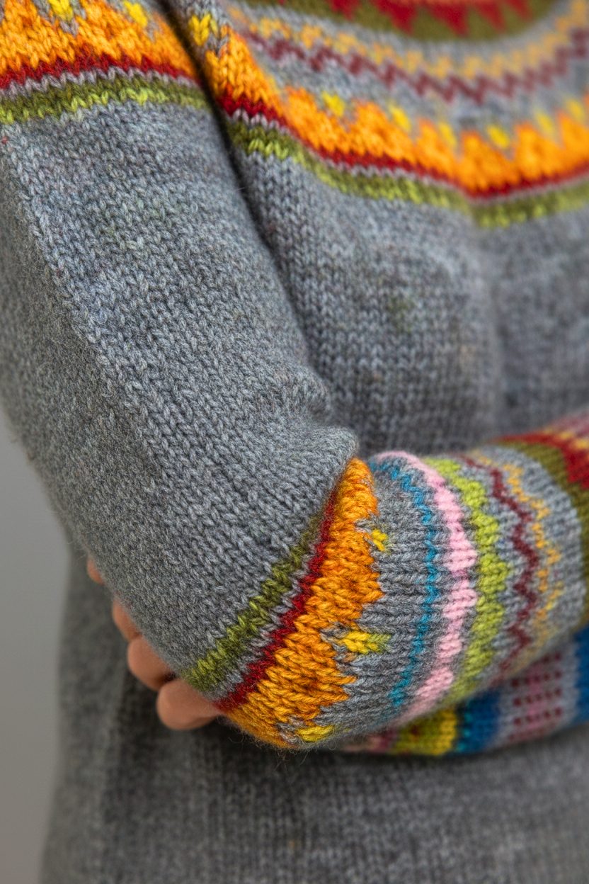 This cosy grey jumper has a soft feel which also highlights its rainbow patterns. The Fair Isle yoke features vibrant oranges, blues and reds in fun zigzags on shoulders and sleeves. It's a cozy pick for cold weather, mixing grey with colourful pops to liven up outfits.